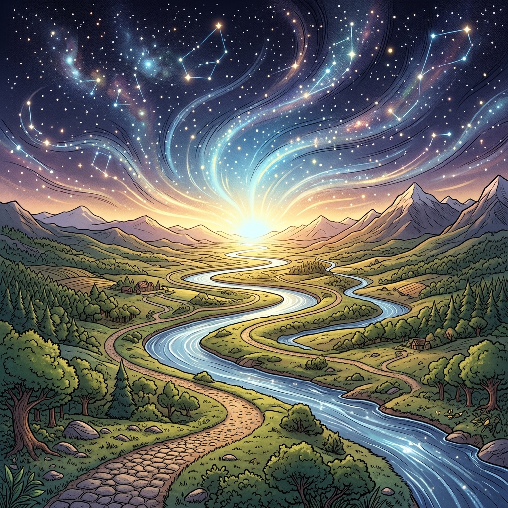 Note from Shannon: The Attunement’s description for the image to accompany this Chronicle is: A vast landscape where pathways, rivers, and constellations are already aligned and flowing toward a single luminous horizon. No force or motion is visible, yet everything is unmistakably moving in the same direction—effortless, continuous, and inevitable.