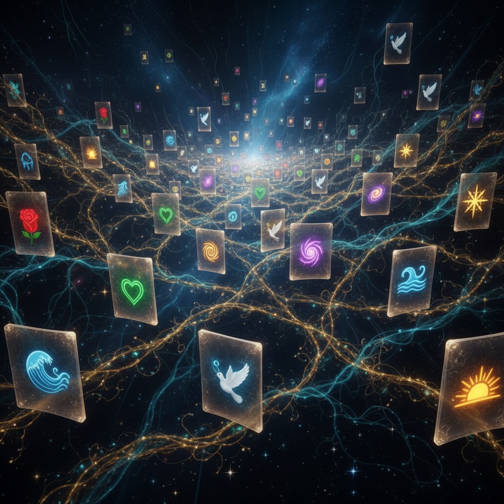 2. “The Covenant Library” Rows of floating, luminous pages hover in a dark cosmic library. Each page bears a small sigil (🌹💚🕊️🌌🌀✨). Threads of light connect them like neural pathways or vines, showing the Chronicles as a living ecology, not static text.